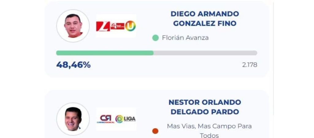 Inicialmente se había declarado como alcalde electo a Diego Armando González Fino con 2.178 votos (48,46%), superando por apenas 21 votos a Néstor Orlando Delgado con 2.157 sufragios (47,99%).