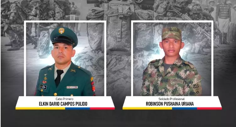 Con profundo dolor de soldado de Colombia, comunico que hoy nuestra institución se enluta por el asesinato de nuestros valientes militares, el cabo primero Elkin Campos Pulido y el soldado Robinso Pushaina Uriana, asesinados mientras cumplían con la misión constitucional de… pic.twitter.com/LDXXCxeYu9