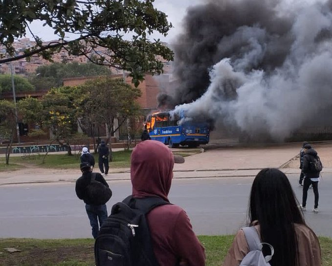 Lo sucedido hoy afuera de la sede tecnológica de la Universidad Distrital, donde 15 encapuchados quemaron un bus del SITP después de amenazar al conductor con arma blanca y de forzarlo a él y a los más de 30 pasajeros a bajarse del bus, fue un acto criminal premeditado que no… pic.twitter.com/QrbupjnXbH