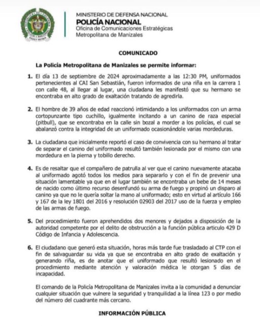 El incidente ocurrió el viernes 13 de septiembre en Manizales, específicamente en el barrio San Sebastián, durante un operativo policial que fue solicitado por la comunidad para atender una situación de riña. Según el comunicado oficial de la Policía Nacional, los uniformados del CAI de San Sebastián acudieron al lugar después de que una mujer alertara sobre el comportamiento violento de su hermano, un hombre de 39 años que se encontraba en un grave estado de alteración y amenazaba a varias personas con un cuchillo.