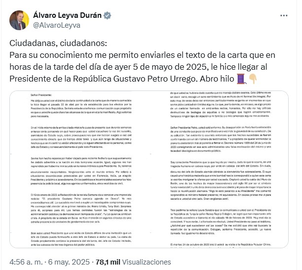Para su conocimiento me permito enviarles el texto de la carta que en horas de la tarde del día de ayer 5 de mayo de 2025, le hice llegar al Presidente de la República Gustavo Petro Urrego. Abro hilo 🧵👇🏼 pic.twitter.com/03GWe0vHBs— Álvaro Leyva Durán (@AlvaroLeyva) May 6, 2025