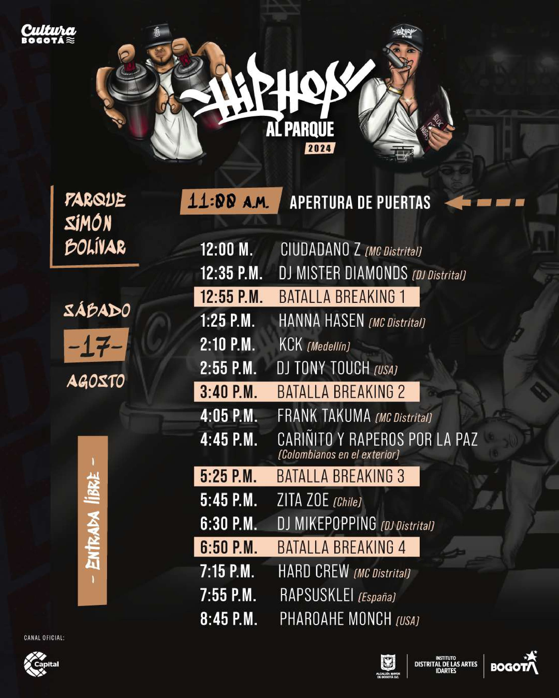 El Instituto Distrital de las Artes – Idartes ha anunciado el cartel de la edición 26 de Hip Hop al Parque, que se celebrará el 17 y 18 de agosto en el Parque Simón Bolívar. Este evento, uno de los más esperados en la escena cultural de Bogotá, contará con la participación de destacados artistas como Cariñito, Flaco Flow y Melanina, Cormega, Chystemc y El Alfarero, entre otros.