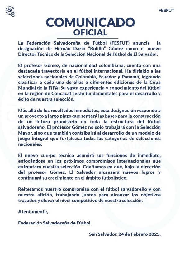 La Federación Salvadoreña de Fútbol (FESFUT) anunció oficialmente la contratación de Hernán Darío “Bolillo” Gómez como nuevo director técnico de la selección nacional durante la noche del lunes 24 de febrero. El nombramiento se produce el mismo día en que la entidad comunicó la salida de David Dóniga Lara del cargo.