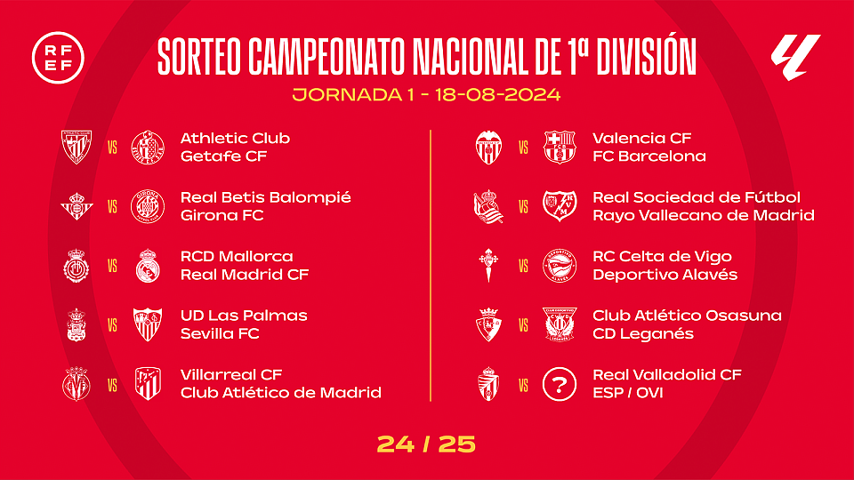 La primera jornada de LaLiga EA Sports contará con otros partidos interesantes, como Athletic-Getafe, Betis-Girona, Las Palmas-Sevilla, Villarreal-Atlético de Madrid, Real Sociedad-Rayo Vallecano, Celta-Alavés, Osasuna-Leganés y Valladolid-Espanyol/Oviedo. El calendario de la temporada 2024/25 consta de 38 jornadas, que se disputarán desde el fin de semana del 16 al 18 de agosto hasta el fin de semana del 25 de mayo.