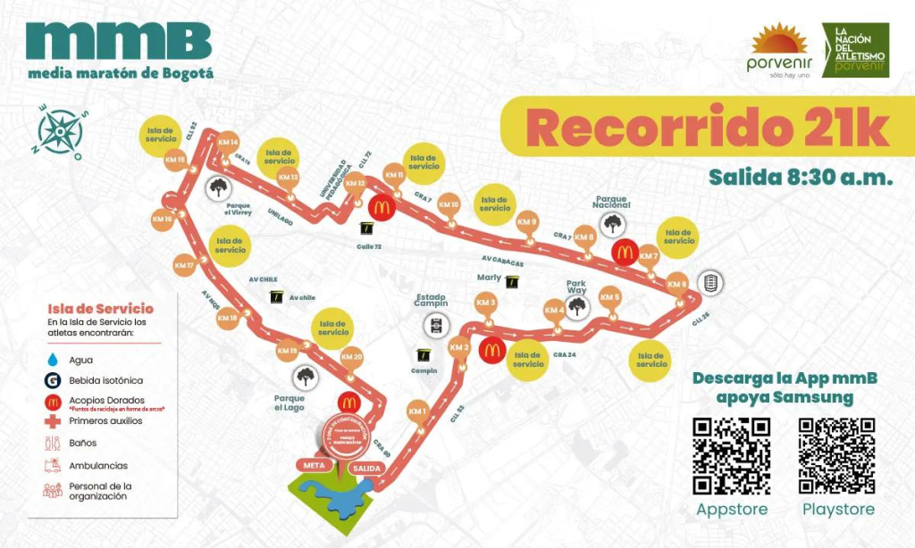 La carrera de 21K tendrá un recorrido que comenzará en la carrera 60, y los atletas podrán acceder al carril de salida a partir de las 7:30 a. m. Las vías habilitadas para los atletas estarán abiertas desde las 8:30 a. m. hasta la 1:00 p. m., por lo que se recomienda a los participantes completar el recorrido dentro de los tiempos establecidos para garantizar una experiencia segura y organizada.