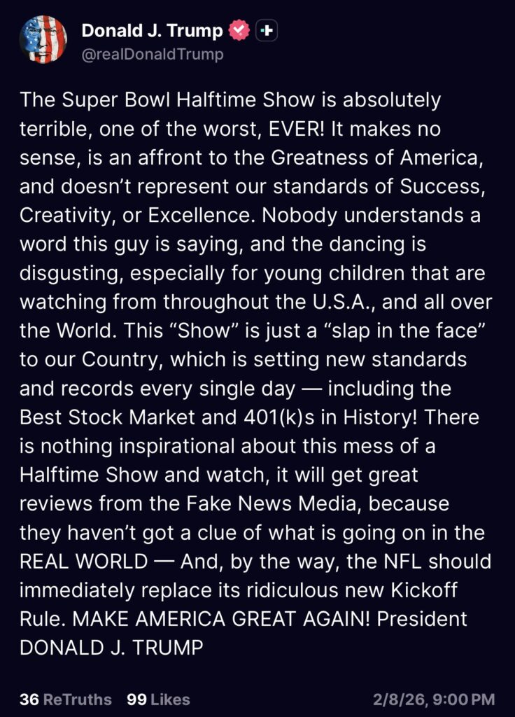 Mientras el espectáculo fue celebrado por seguidores y sectores culturales, el presidente de Estados Unidos, Donald Trump, criticó duramente la presentación. A través de la red social Truth Social, calificó el show como “uno de los peores de la historia” y cuestionó el contenido artístico del cantante.