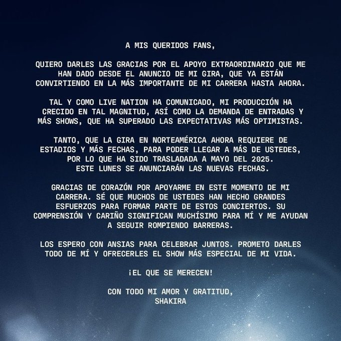 La artista informó a sus seguidores a través de sus redes sociales que las presentaciones programadas para noviembre y diciembre de 2024 se postergarán hasta mayo de 2025. Esto significa que Shakira iniciará su gira mundial en Suramérica en febrero de 2025.