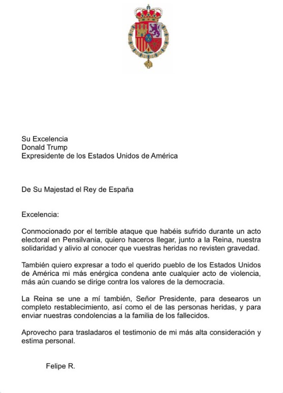 Desde Europa, el rey Felipe VI de España también manifestó su repudio al atentado y su alivio porque las heridas de Trump no fueron graves. En una carta, el rey expresó que tanto él como la reina Letizia se unen a la condena del ataque y desean una pronta recuperación de los heridos. Además, extendieron sus condolencias a las familias de los fallecidos, subrayando la necesidad de restablecer el orden y garantizar la seguridad de todos los ciudadanos.