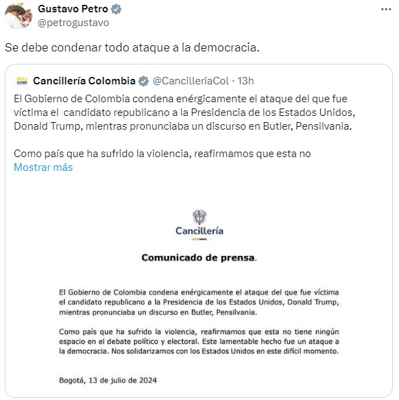 El presidente de Colombia, Gustavo Petro, utilizó su cuenta de X para citar el comunicado de la Cancillería colombiana, que condenó enérgicamente el ataque. Petro enfatizó: “Se debe condenar todo ataque a la democracia”. Este mensaje subraya la importancia de defender los valores democráticos y rechazar cualquier forma de violencia política.