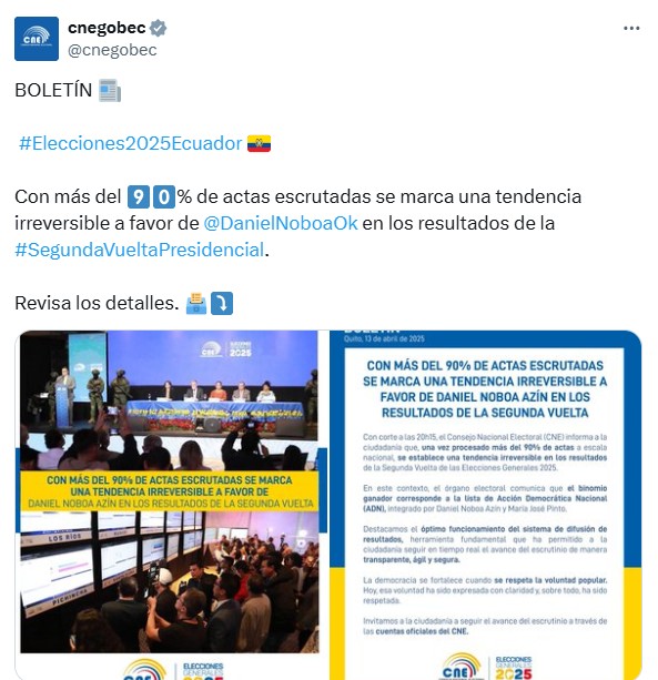 Con más del 90 % de los votos escrutados, el Consejo Nacional Electoral (CNE) declaró una tendencia irreversible que posiciona a Daniel Noboa y su fórmula vicepresidencial, María José Pinto, como ganadores de las elecciones presidenciales de 2025.