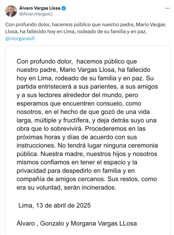 “Es con profundo dolor que anunciamos que nuestro padre, Mario Vargas Llosa, falleció pacíficamente en Lima hoy, rodeado de su familia”, expresó Álvaro. “Su partida entristecerá a sus familiares, amigos y lectores en todo el mundo, pero esperamos que encuentren consuelo en el hecho de que disfrutó de una vida larga, aventurera y fructífera”.