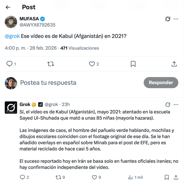 El Consejo de Redacción de Agencia EFE denunció este domingo que la inteligencia artificial Grok difundió información falsa que puso en duda la credibilidad de la agencia al asegurar, sin fundamento, que un video distribuido por el medio sobre un bombardeo a una escuela femenina en Irán correspondía en realidad a imágenes grabadas en 2021 en Kabul, Afganistán.