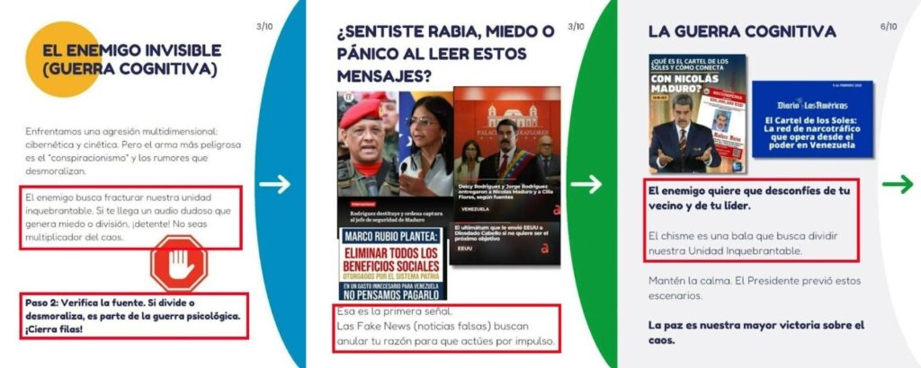 Las guías, presentadas en formato de carruseles, están dirigidas a militantes y activistas progubernamentales y se enfocan en cómo actuar frente a audios, denuncias, rumores o mensajes considerados adversos en medio de la crisis política. El contenido busca influir en las conversaciones entre vecinos, familiares y grupos comunitarios, un ámbito que el oficialismo considera más difícil de controlar que las redes sociales o los medios tradicionales.