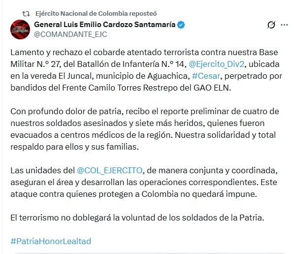 “Fue atacada la Base Militar del 27, perteneciente al Batallón de Infantería N.° 14, ubicada en la vereda El Juncal, jurisdicción de Aguachica, Cesar, mediante una acción terrorista con artefactos explosivos. De manera preliminar se conoce que siete de nuestros soldados fueron asesinados y, al parecer, 32 más resultaron heridos”, señaló el Ejército a través de su cuenta oficial en la red social X.