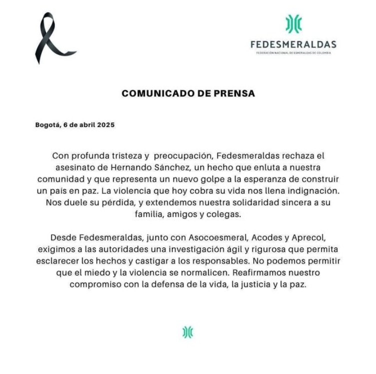 La Federación de Esmeralderos del país se pronunció frente al hecho y pidió justicia: