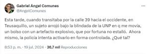 Gabriel Ángel compartió en su cuenta de X, previamente conocida como Twitter, detalles del intento de atentado: “Esta tarde, cuando transitaba por la calle 39 hacia el occidente, en Teusaquillo, un sujeto arrojó bajo la blindada de la UNP en que me movía un bolso con un artefacto explosivo, que, por fortuna, no estalló. Ahora mismo, la policía intenta activarlo en forma controlada”.