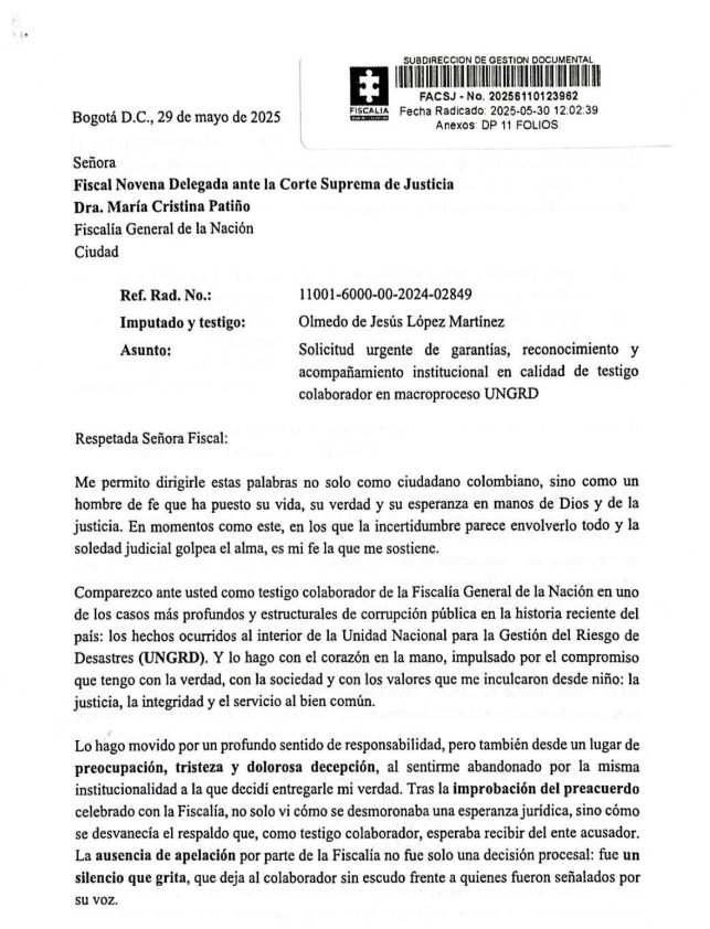 Olmedo López, exdirector de la Unidad Nacional para la Gestión del Riesgo de Desastres (UNGRD) y testigo clave en el escándalo de corrupción que involucra a altos funcionarios del Gobierno Petro, envió una carta a la Fiscalía General de la Nación en la que expresa su inconformidad con el tratamiento que ha recibido por parte del sistema judicial, pese a su papel central en la revelación del entramado de irregularidades.