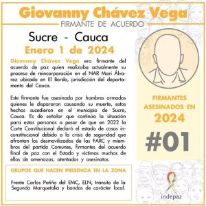 El nuevo año comenzó con un trágico suceso en el departamento de Cauca, donde fue asesinado Giovanny Chávez Vega, un destacado firmante del Acuerdo de Paz. El crimen tuvo lugar en las primeras horas de la madrugada en Sucre, específicamente en el NAR Mari Álvarez ubicado en El Bordo, donde Chávez realizaba su proceso de reincorporación.