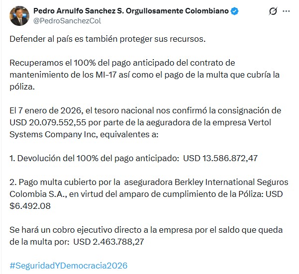 La División de Aviación Asalto Aéreo del Ejército informó que la aseguradora Berkley International Seguros Colombia giró este martes 20 millones de dólares al Tesoro Nacional, como parte de una sanción y la recuperación de un pago anticipado asociado al contrato de mantenimiento de la flota de helicópteros MI-17 de la institución.