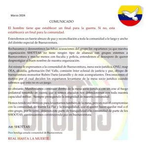 “Manifestamos continuar dentro de la mesa sociojurídica con un cese al fuego unilateral, teniendo en cuenta que, si somos atacados, nos defenderemos con toda nuestra capacidad militar, siempre protegiendo la integridad de nuestra comunidad”, declararon los Shottas.