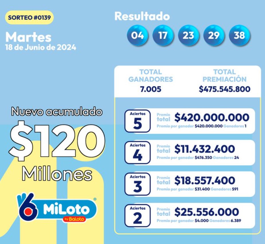 La noche del martes 18 de junio nació un nuevo millonario en Colombia, luego que un afortunado participante acertara los números ganadores del sorteo #0139 de MiLoto y se llevó a casa la impresionante suma de 420 millones de pesos.