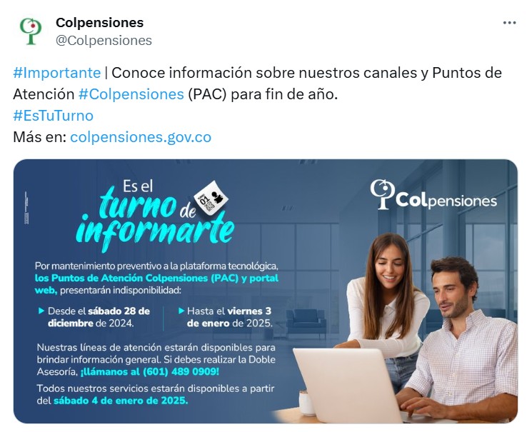Colpensiones detalló que la atención en línea se reanudará el sábado 4 de enero de 2025, mientras que los PAC retomarán actividades el martes 7 de enero de 2025. A partir de estas fechas, se espera que todos los servicios, tanto presenciales como virtuales, funcionen con normalidad.