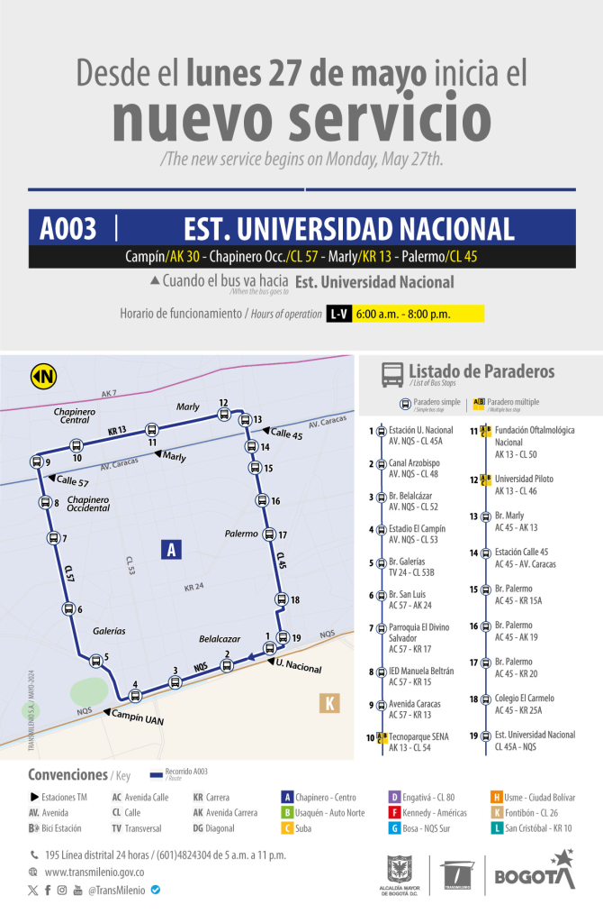 Como medida alterna, TransMilenio S.A. implementará desde el 27 de mayo la ruta circular A003 Estación Universidad Nacional. Esta ruta operará de lunes a viernes entre las 6:00 a.m. y 8:00 p.m., conectando distintos puntos estratégicos.