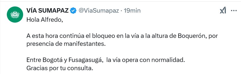 La Concesión Vial Sumapaz ha recomendado a los conductores planear sus desplazamientos con anticipación y optar por rutas alternas para evitar quedar atrapados en el bloqueo.