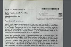 En la carta de renuncia, hecha pública este lunes 18 de marzo, Gallego señala su profundo compromiso con los ideales que guían el Plan Nacional de Desarrollo, reafirma su “convicción en la necesidad de avanzar en la reducción de las brechas de desigualdad históricas” y su respaldo al enfoque de una economía “al servicio del bien común”.