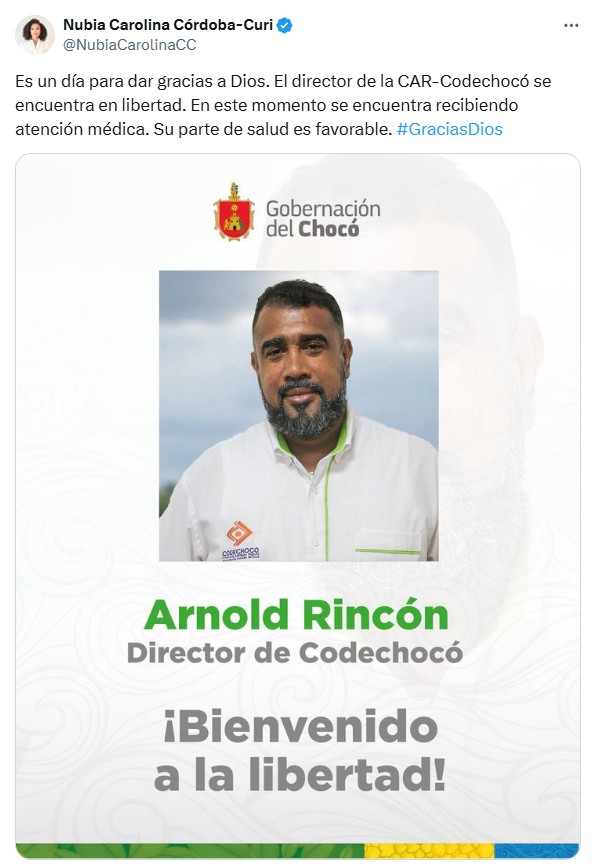 “Es un día para dar gracias a Dios. El director de la CAR-Codechocó se encuentra en libertad. En este momento se encuentra recibiendo atención médica. Su parte de salud es favorable”, publicó en sus redes sociales.