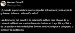 “¿Y cuándo la Procuraduría no investiga las actuaciones y mis actos de gobierno, tal como lo hizo Ordóñez? Las decisiones del ministro de educación ad hoc para el caso de la Universidad Nacional son también mis decisiones”, manifestó Petro, cuestionando la potestad del ente de control.