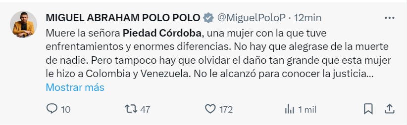 Por su parte, el congresista Miguel Polo Polo escribió en su cuenta en X que aunque no hay que alegrarse de la muerte de nadie, en el caso de Piedad Córdoba, “tampoco hay que olvidar el daño tan grande que esta mujer le hizo a Colombia y Venezuela. No le alcanzó para conocer la justicia”, dijo. Aunque minutos más tarde borró el mensaje.