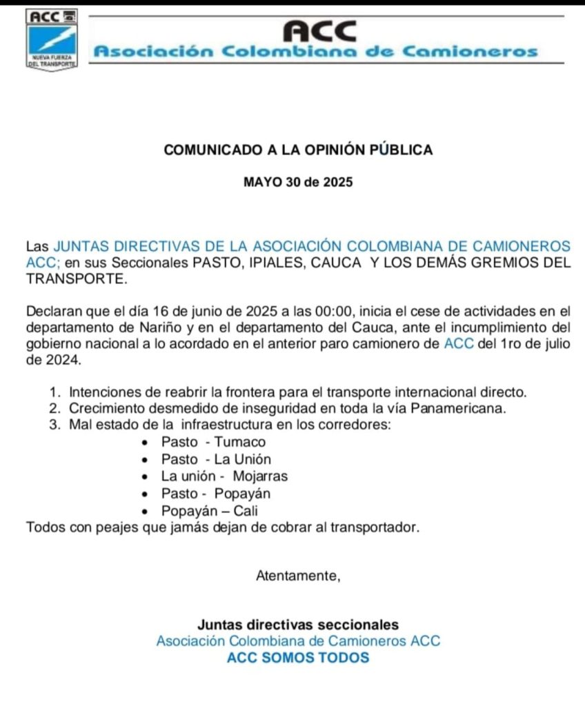 La Asociación Colombiana de Camioneros (ACC) anunció una nueva jornada de bloqueos viales a partir del lunes 16 de junio, desde las 00:00 horas, en varias rutas estratégicas del sur del país, especialmente en los departamentos del Cauca y Nariño. La decisión, según el gremio, se debe a reiterados incumplimientos del Gobierno nacional frente a acuerdos firmados en anteriores negociaciones.