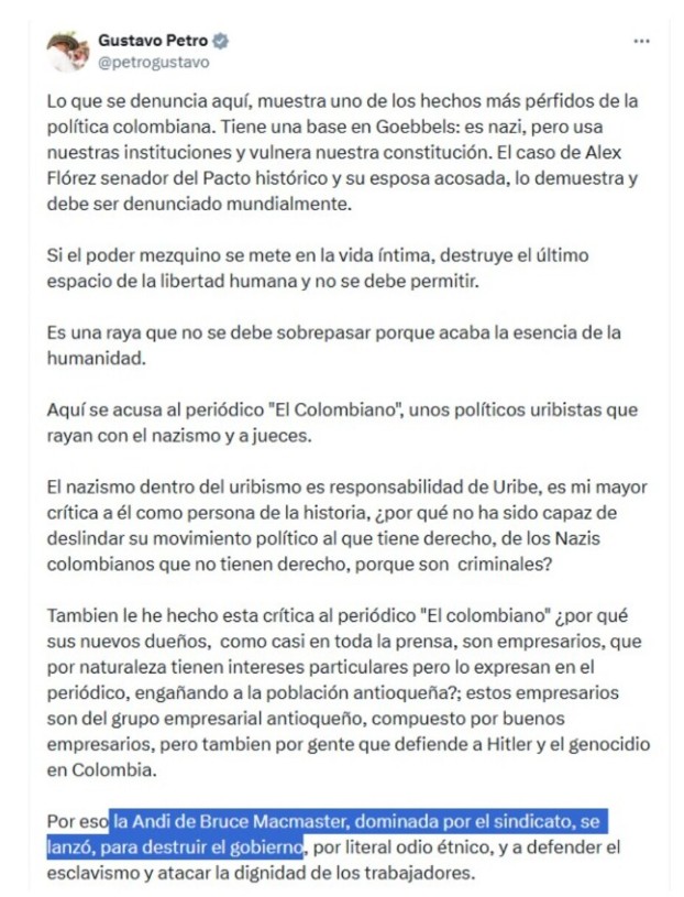 El trino publicado por el jefe de Estado hacía parte de un hilo en el que criticaba a empresarios antioqueños vinculados a sectores políticos del uribismo. En el mensaje, el mandatario acusó directamente a la ANDI, liderada por Bruce Mac Master, de promover odio étnico y de defender prácticas esclavistas.