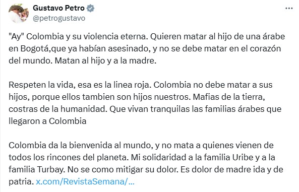 “Quieren matar al hijo de una árabe en Bogotá, que ya habían asesinado, y no se debe matar en el corazón del mundo. Matan al hijo y a la madre. Respeten la vida, esa es la línea roja. Colombia no debe matar a sus hijos, porque ellos también son hijos nuestros. Mafias de la tierra, costras de la humanidad. Que vivan tranquilas las familias árabes que llegaron a Colombia”, escribió Petro.}