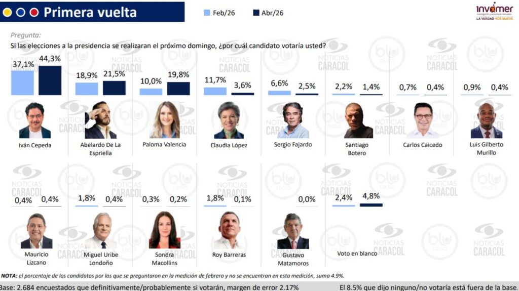 El estudio, realizado entre el 15 y el 24 de abril de 2026, se basó en 3.800 encuestas presenciales en 149 municipios del país, con un margen de error de 1,89 % y un nivel de confianza del 95 %. Los resultados muestran que Cepeda alcanza el 44,3 % de intención de voto en primera vuelta, lo que representa un crecimiento de siete puntos frente a la medición de febrero.