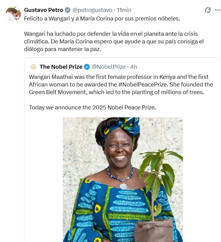 “Felicito a Wangari y a María Corina por sus premios nóbeles”, escribió de entrada el presidente Petro, haciendo referencia inicialmente a Wangari Maathai, una bióloga, ecologista y activista política keniana, reconocida por ser la primera mujer africana en recibir el Premio Nobel de la Paz. Se le conoce como “la mujer árbol” por su labor de reforestación, quien recibió el galardón en 2004 por su contribución al desarrollo sostenible, la democracia y la paz.