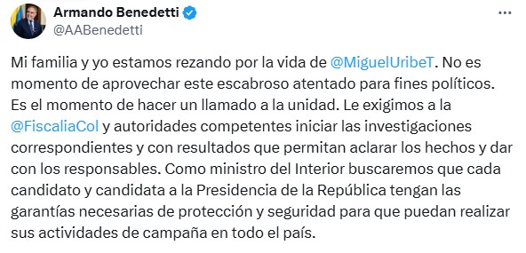 En su declaración, Benedetti también hizo referencia al vínculo personal que mantiene con Miguel Uribe Turbay. “Solidaridad con Miguel Uribe y su familia en este difícil momento. A Miguel le tengo todo el afecto, lo conozco desde muy joven. Rechazamos todos los actos de violencia”, añadió.