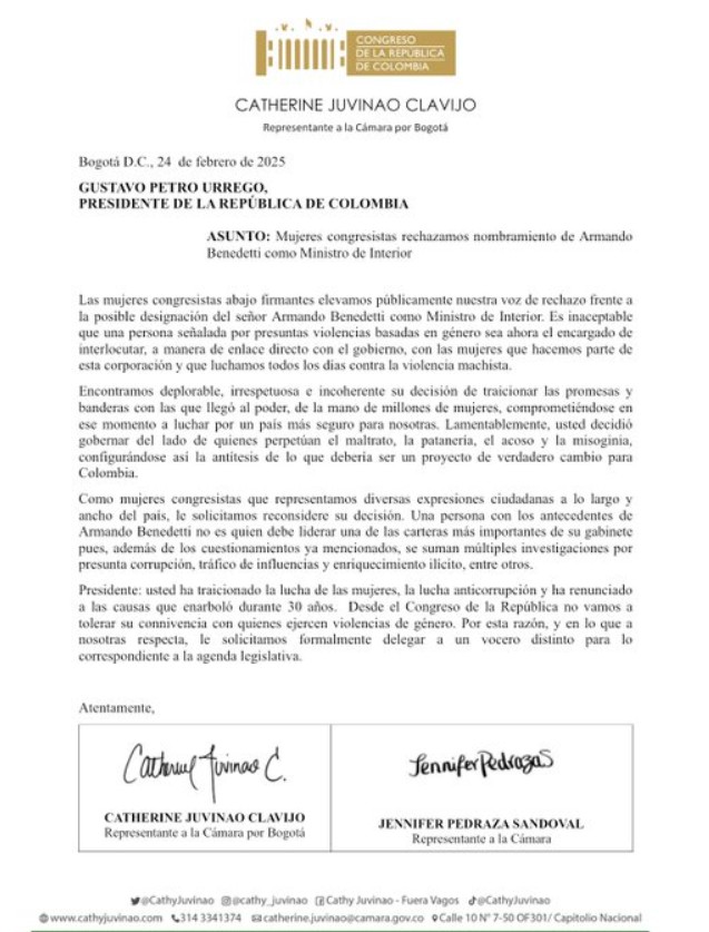 En una carta dirigida al presidente Gustavo Petro, las congresistas firmantes expresaron su rechazo al nombramiento, argumentando que “es inaceptable que una persona señalada por presuntas violaciones basadas en género sea ahora el encargado de interlocutar, a manera de enlace directo con el Gobierno, con las mujeres que hacemos parte de esta corporación (Congreso) y que luchamos todos los días contra la violencia machista”.