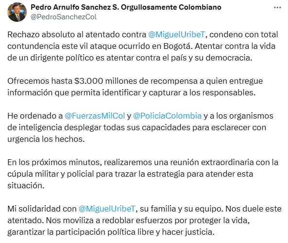 En su declaración, Sánchez también envió un mensaje de solidaridad a Miguel Uribe, su familia y a todo su equipo de trabajo. “Nos duele este atentado. Nos moviliza a redoblar esfuerzos por proteger la vida, garantizar la participación política libre y hacer justicia”, añadió.