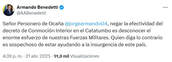 En su cuenta oficial de X (antes Twitter), Benedetti señaló que “negar la efectividad del decreto de Conmoción Interior en el Catatumbo es desconocer el enorme esfuerzo de nuestras Fuerzas Militares. Quien diga lo contrario es sospechoso de estar ayudando a la insurgencia de este país”.