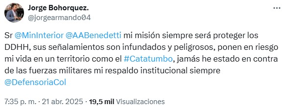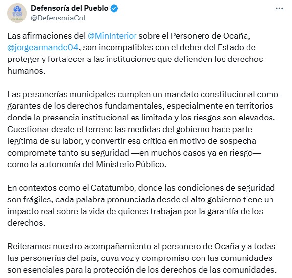 En medio de la controversia, el ministro Armando Benedetti respondió a las reacciones de los personeros asegurando que respeta la labor de quienes defienden los derechos humanos, pero hizo un llamado específico al personero de Ocaña: “Sí pedimos la colaboración del personero de Ocaña porque está en riesgo la vida de miles de personas en el Catatumbo y el desplazamiento masivo en la región”.
