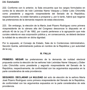 En un fallo contundente, la Sala de lo Contencioso Administrativo del alto tribunal argumentó que “la elección de la (senadora) María José Pizarro Rodríguez como primera vicepresidente de la cámara alta del Congreso desconoce lo dispuesto en el artículo 40 de la ley 5° de 1992, por cuanto pertenece a la agrupación que más curules ostenta en esta corporación”.