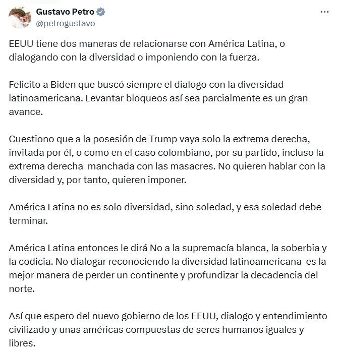 “América Latina no es solo diversidad, sino soledad, y esa soledad debe terminar. No dialogar, reconociendo la diversidad latinoamericana, es la mejor manera de perder un continente”, afirmó Petro en su mensaje dirigido a Trump.