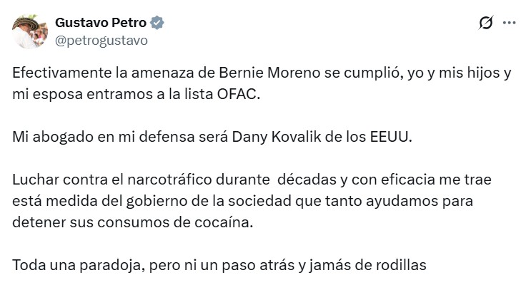 “Jamás he tenido relación alguna con estructuras del narcotráfico. Esta sanción busca debilitar nuestro proyecto de paz y soberanía”, declaró el presidente desde la Casa de Nariño. Su hija, Andrea Petro, también defendió públicamente la inocencia de su familia y calificó la medida como una “afrenta contra la democracia colombiana”.