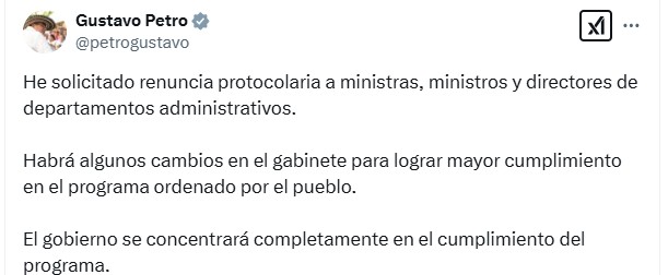 El presidente de Colombia, Gustavo Petro, anunció a través de su cuenta en X que ha solicitado la renuncia protocolaria de todos sus ministros y ministras, así como la de los directores de departamentos administrativos que integran su gabinete.