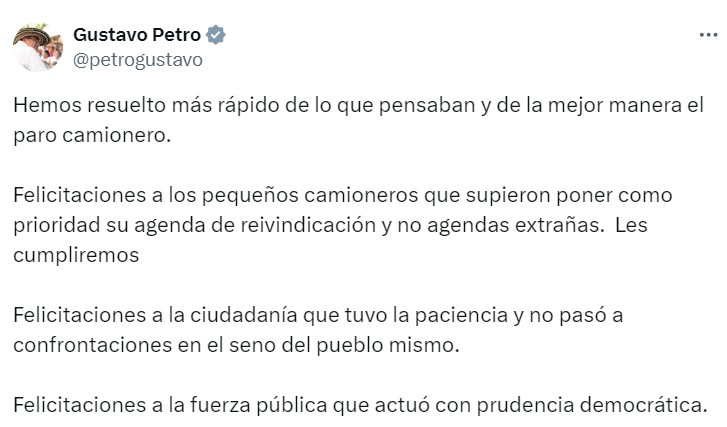 El presidente Gustavo Petro anunció que el Gobierno ha logrado resolver el paro camionero de manera rápida y efectiva, tras llegar a un acuerdo con los transportadores que se movilizaban en diferentes regiones del país. En un pronunciamiento a través de su cuenta X, el mandatario felicitó a los pequeños camioneros por priorizar su agenda de reivindicación y destacó que no se dejaron influenciar por agendas externas.
